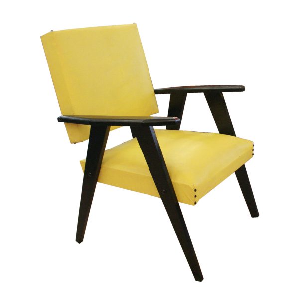 A mid century armchairs. French design ebony wooden structure, original yellow PVC upholstery.