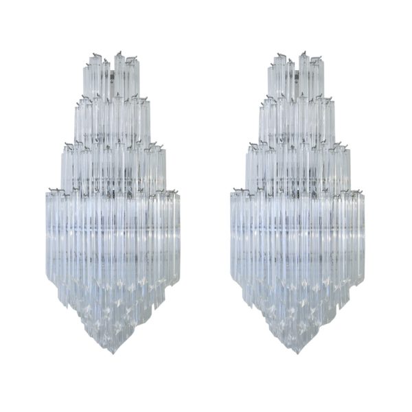 Pair of wall lights , Clear cut blown glass components ” Quadriedri “suspended on a semi-circular chromed metal frame. Made in Italy
