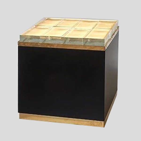 Illuminating coffee table. Black enamelled metal structure with brass edges on base and top. Clear brass bricks top. Italian design Mid Century style.