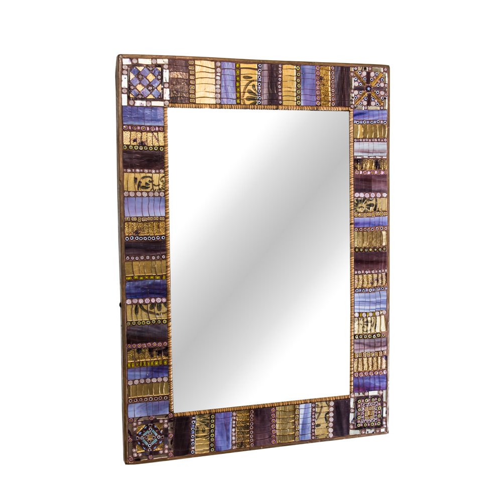 Unique breathtaking early 2000s mosaic mirror Bizantine style multicolored glass tassels with gold and silver inclusions. Copper lined edges. Designed and made by artist Dusciana Bravura. Made in Italy Born in Venice, Italy (1969), Dusciana Bravura graduated from Ravenna’s Mosaic Art Institute and later attended the Academy of Fine Arts in Bologna. Dusciana’s vision suggests a willingness to lead the multifaceted world of contemporary art back to the unifying vision of the mosaic artist, asserting the compatibility of her ancient technique with contemporary artistic expression. Dusciana’s works of art with their unique technical treatment, restore to Mosaic Art, function and destiny.