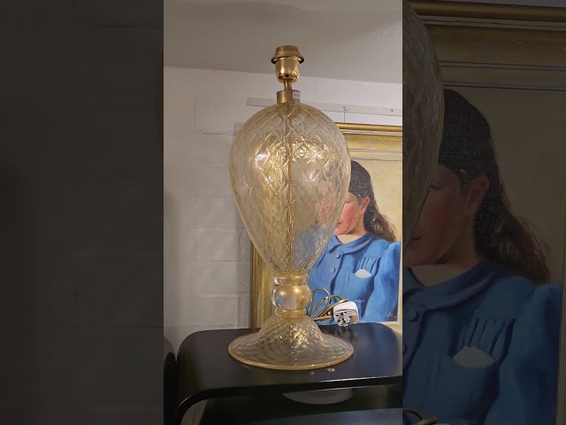 These exquisite table lamps are a pair of blown Murano glass Veronese lamps. They are crafted using clear glass with luxurious gold inclusions, creating a rich and opulent look. The glass surface is meticulously hand-worked to create beautiful romboidal lines. These stunning lamps are made in Italy by the skilled artisan Alberto Dona.