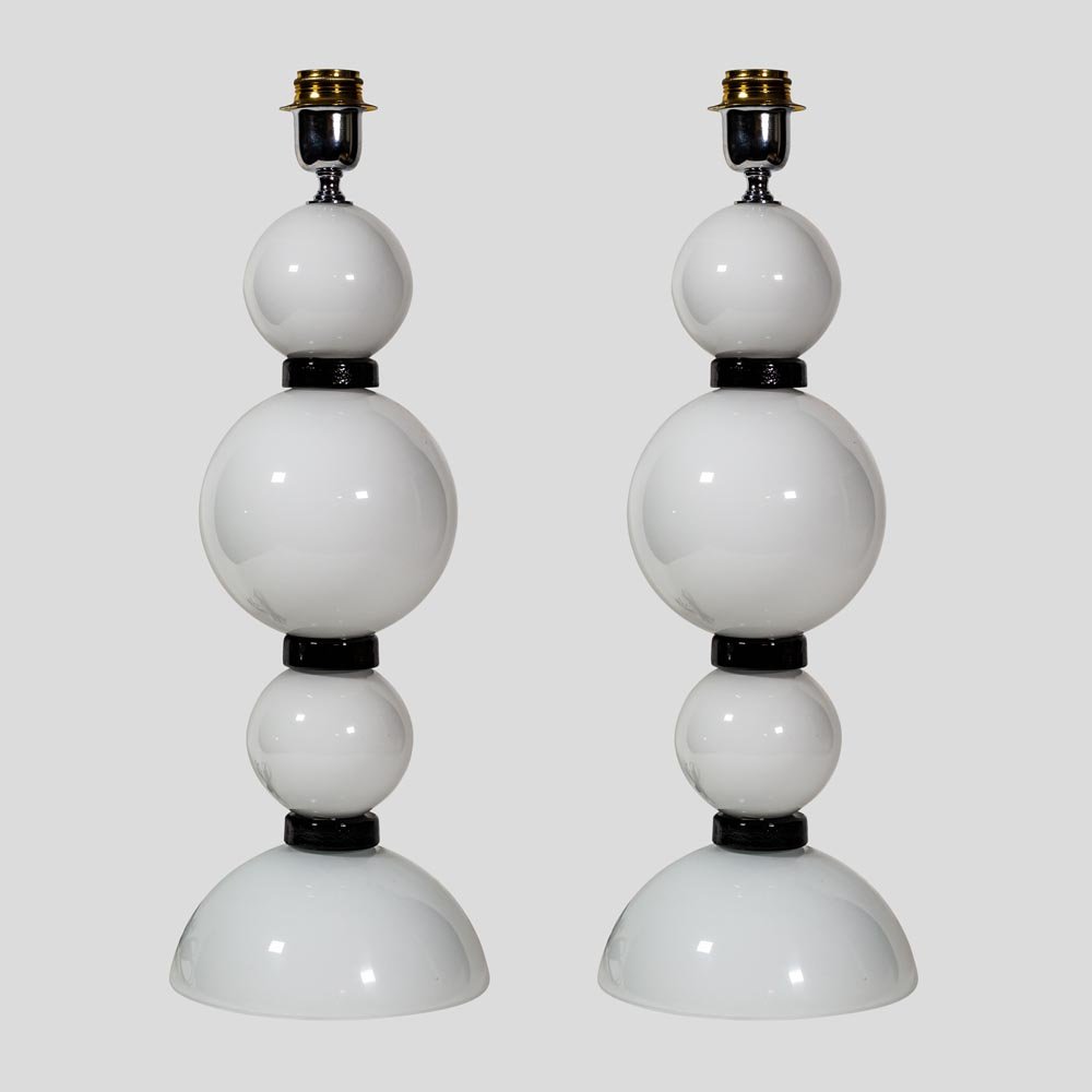 A wonderful pair of table lamps, Italian design made in Murano, 1970’s. Blown black and white glass. Three spheres on a semi spherical base. Signed on the base by the artist Alberto Dona.
