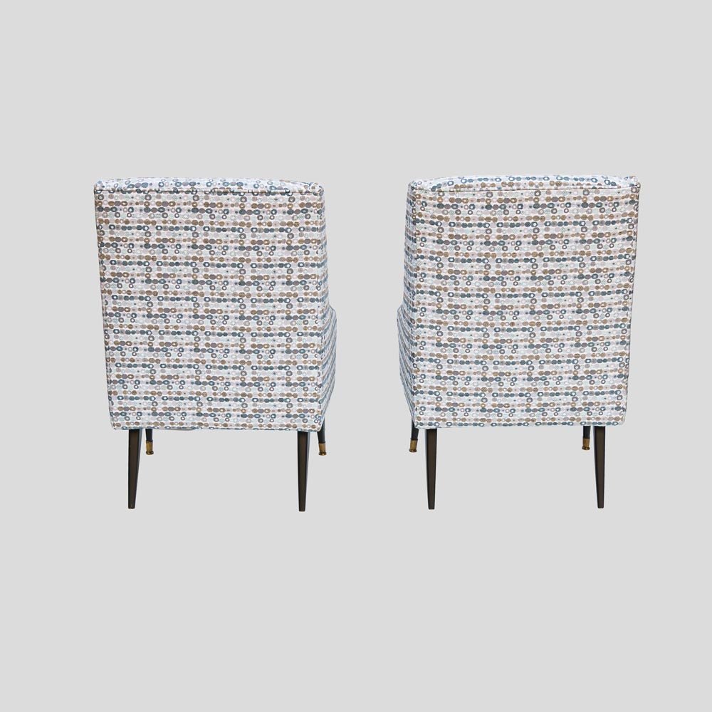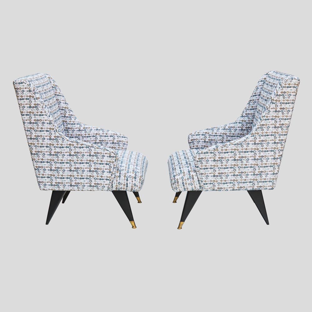 Pair of Mid century low seating armchairs recovered in Shannon splash powder teal fabric, black lacquered feet with brass metal ending front feet. Made in Italy ca. 1950s