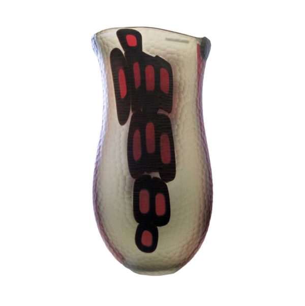 A unique blown glass vase with several techniques involved submerged, murrine and battuto. Rare and precious. Fume blown glass black and red murrine. Red stripes on sides by Afro Celotto.