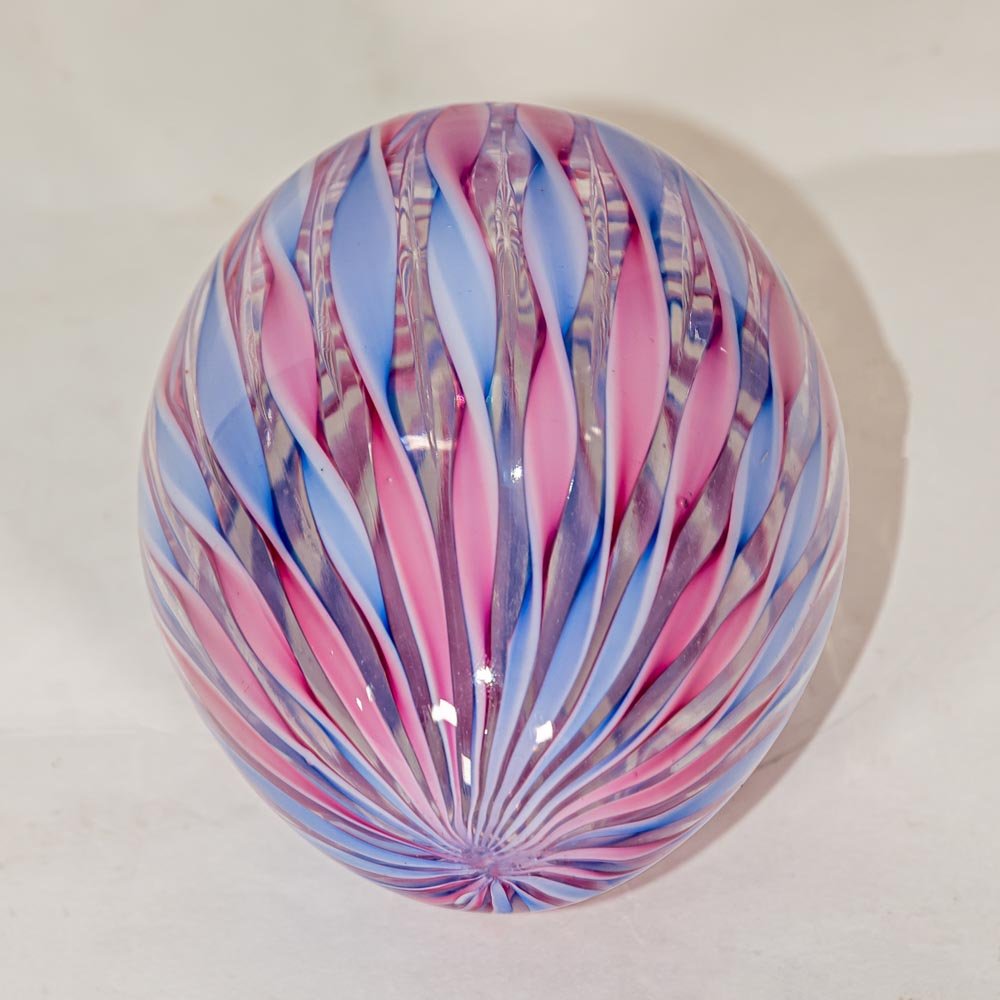 Vintage decorative Murano Glass Egg shaped object. This beautiful, egg-shaped piece of Murano glass was created in the 1950s. The ribbon twist in pink, white, and blue is a stunning example of the skilled craftsmanship of Murano glassworkers. This piece is sure to add a touch of elegance to any room it is displayed in.
